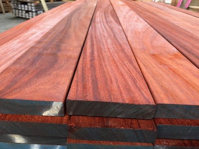 Le Padouk (Pterocarpus soyauxii), originaire du Gabon, est un bois exotique haut de gamme reconnu pour sa couleur rouge-orangé éclatante qui se stabilise en un brun rouge profond. Très durable et naturellement en classe 4, il résiste parfaitement aux intempéries, insectes et champignons. Sa grande stabilité et sa densité élevée en font un matériau idéal pour des terrasses élégantes et pérennes.